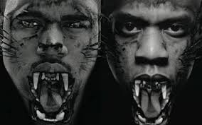 The inside of the Watch the Throne digipak shows portraits of kanye west and jay z. The colour of the inside is black and white which goes with the gold album cover. What makes the the inside look power is that both of Kanye West and Jay Z have been blended in together with a tiger. Wild animals such as tigers and lions are very aggressive and dominant which relates to jay z and kanye west where they have dominantly taken over the rap game. With Jay Z and Kanye West's faces being blended in with animals it shows they superiority in the game.
